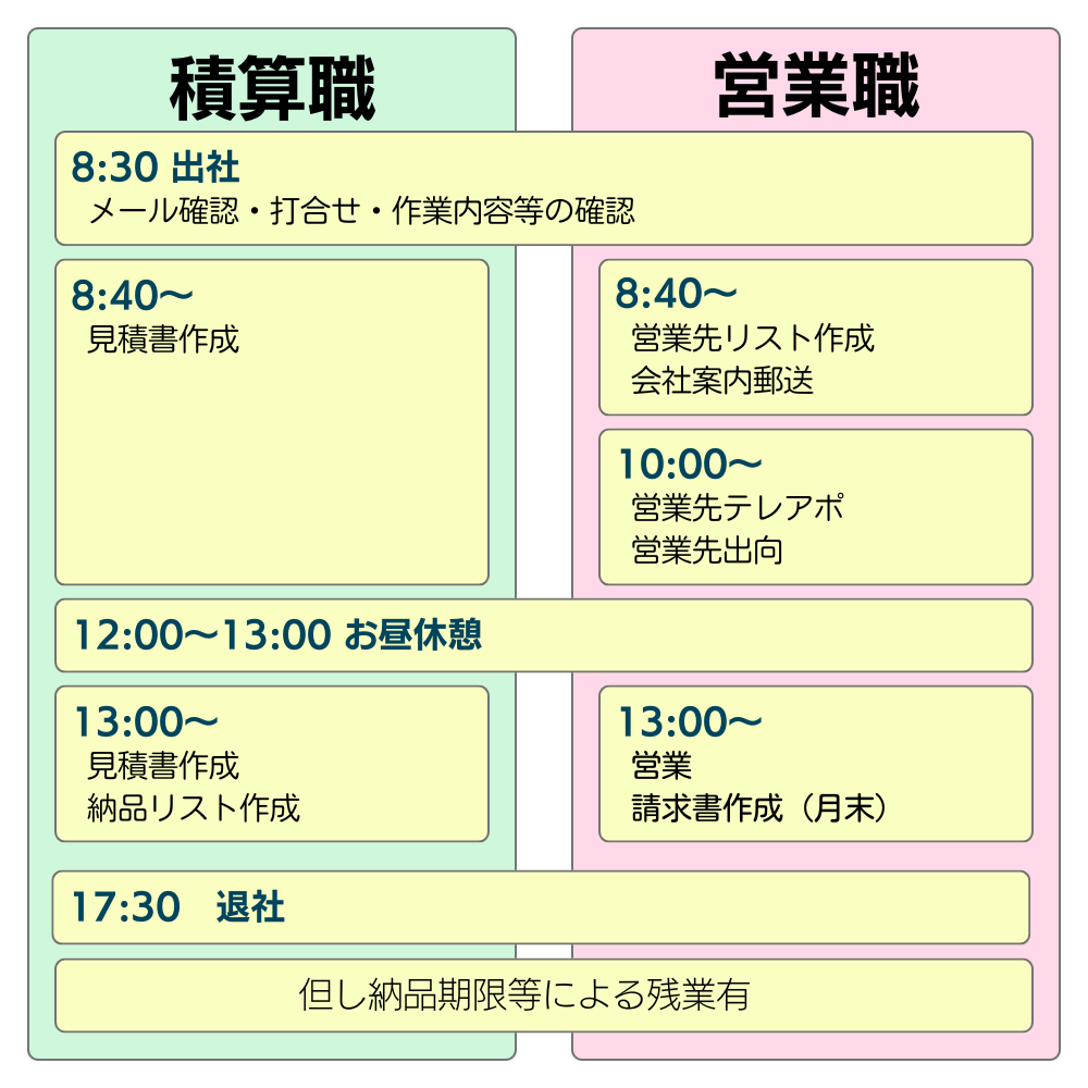 募集要項 一日の流れ 教育プログラム 応募方法 募集要項 【 積算職 】 応募資格一般的なPC操作スキル(Excel等)未経験者歓迎建設業経験者・解体業経験者・積算経験者優遇 雇用形態正社員または請負 職種積算職 仕事内容見積作成・現地調査 給料正社員:月給25万円~請負:応相談 待遇社会保険完備(厚生年金・労災・健康保険・雇用保険)交通費支給 休日週休二日制・夏季休暇・冬季休暇・有給休暇(基本暦通り) 勤務時間8:30~17:30(途中休憩あり) 備考将来的に在宅ワーク可能です。 【 営業職 】 応募資格一般的なPC操作スキル(Excel等)テレアポ含む営業経験 雇用形態正社員またはパート・アルバイト 職種営業職 仕事内容正社員:新規顧客開拓、既存顧客挨拶回りパート・アルバイト:会社案内郵送、テレアポ営業 給料正社員:月給25万円~ + インセンティブパート・アルバイト:時給1500円~ 待遇社会保険完備(厚生年金・労災・健康保険・雇用保険)交通費支給 休日週休二日制・夏季休暇・冬季休暇・有給休暇(基本暦通り) 勤務時間8:30~17:30(途中休憩あり) 備考特記なし 一日の流れ 教育プログラム (積算職・営業職共通) 1年目 建設業および解体業の機材・機械等の学習 解体工法の学習 建築図の見方→読解 見積り仕様書の見方→読解→見積作成 解体工事における施工手順・資機材の学習、見積り項目の拾い出し・数量計算 現地調査同行 積算経験者及び解体工事経験者が少ない事は十分理解した上で、未経験の方にもゆっくり丁寧に、解体工事はこういうやり方があって、こういう資機材を使用し、こういう手順で壊していくを学んでいただきます。 2年目 現地確認(現地でクレーンが設置可能かなどの確認) 届出書類等の提出による協力会社に指示出しおよび簡単なゲラ書き 歩掛りの学習 一軒家や簡易な解体見積書作成 将来学習になる歩掛りの基礎学習と、客先の解体現場を拝見しながら、自分が計画した施工手順ややり方で作業しているか?など実際に目で見ていただき、この作業が何人で何日間で終わるのか?の歩掛りを意識していただきます。 3年目 歩掛りの学習 届出書類の確認 改修工事・公共工事および読解が必要な難工事の見積書作成 ご自身の得意・不得意を十分理解して見積作成+営業など幅広く無理のない範囲での勤務となります。 応募方法 エントリー 採用のお申し込みは随時受け付けております。 メールフォームよりご連絡ください。 書類選考 ご提出いただきました提出書類にて書類審査を行います。※選考結果は合否に関わらず、ご連絡いたします。 面接 日程調整をさせていただき、面接を行います。※合否に関わらず、一週間以内に選考の結果をご連絡いたします。 内定 勤務開始日の調整をさせていただきます。 個人事業主・副業募集 空き時間を利用して見積り作成を手伝っていただける個人事業主や副業を募集しています。 解体及び内装解体の見積り作成経験者優遇公共工事見積り作成者歓迎(建築)足場等仮設図面・解体工事ステップ図作成CADオペレータ募集 協力会社募集 業務遂行の中で解体施工会社や弋会社などをご紹介してほしいとお声をいただくことがあるため、建設業(解体業)に連携する企業様を募集しています。 お取引をご検討いただける企業様は、対応可能エリアや職種を明記の上、メールフォームよりご連絡をお待ちしております。